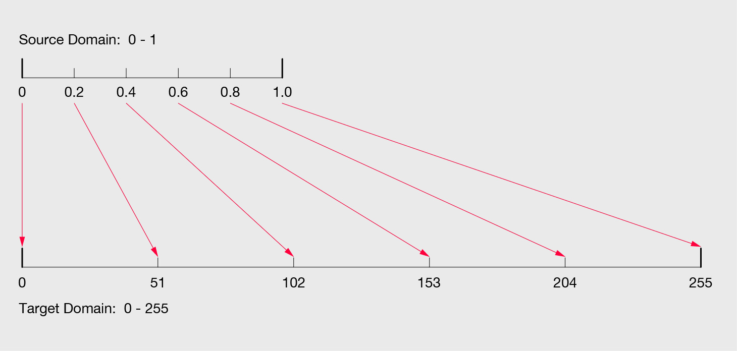 The above diagram shows how numbers form 0-1 would be remapped to a domain of 0-255. In this example we will remap the X,Y, and Z values of an individual marker to a domain of 0-255 to recreate there spatial coordinates as RGB color values.