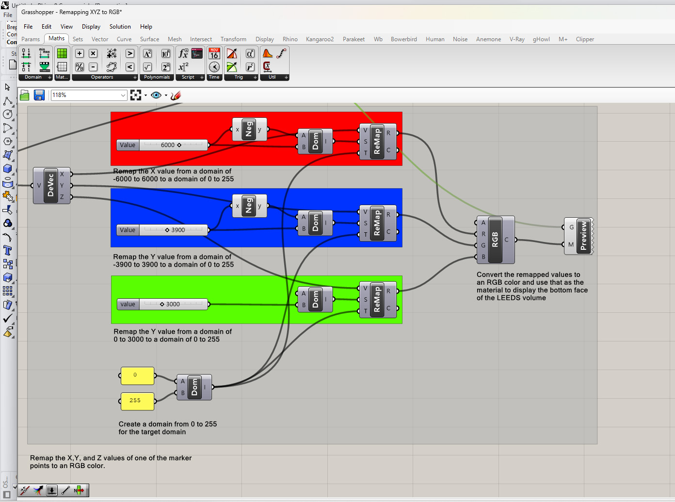 In the above example we are remapping the X,Y, and Z values of a single marker to RGB color values. We will use the bounds of Leeds Studio as the initial domain to remap the spatial coordinates: