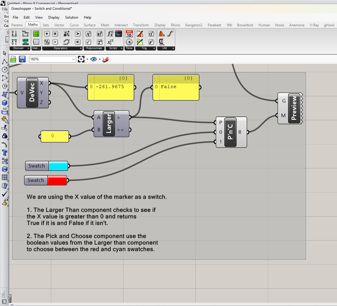 The definition above you a greater than component to test if the X coordinate of the marker is greater than 0. One side of Leeds studio is negative and the other is positive so depending on where the object is in relation to center of the room, this component will return a true or false value. That value is plugged into a Pick and Choose component. The PnC component takes two other inputs that it will choose from based on the pattern (true or false) that is plugged into the pattern input. Two swatches are plugged in and then used to preview the base surface of the volume representing Leeds. The color of this surface will switch between the two swatches depending on the position of the marker along the X axis.