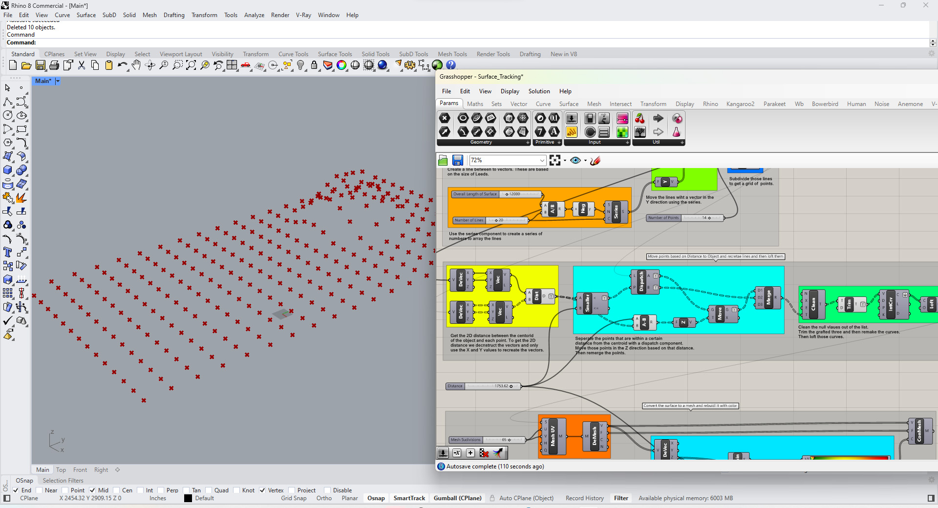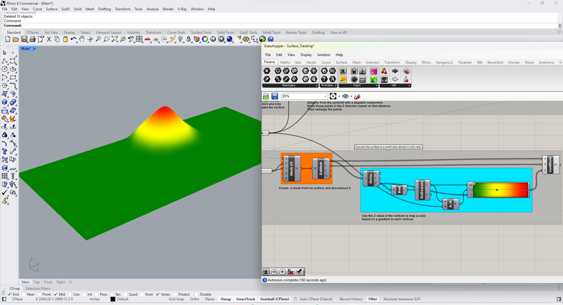 4. To map a gradient based on height of the surface we need to create a mesh and then rebuild it. Once we convert the surface to a mesh we can deconstruct the mesh and then recreate it with its vertices and faces. We can give each vertices a color based on its Z value mapped to a gradient.