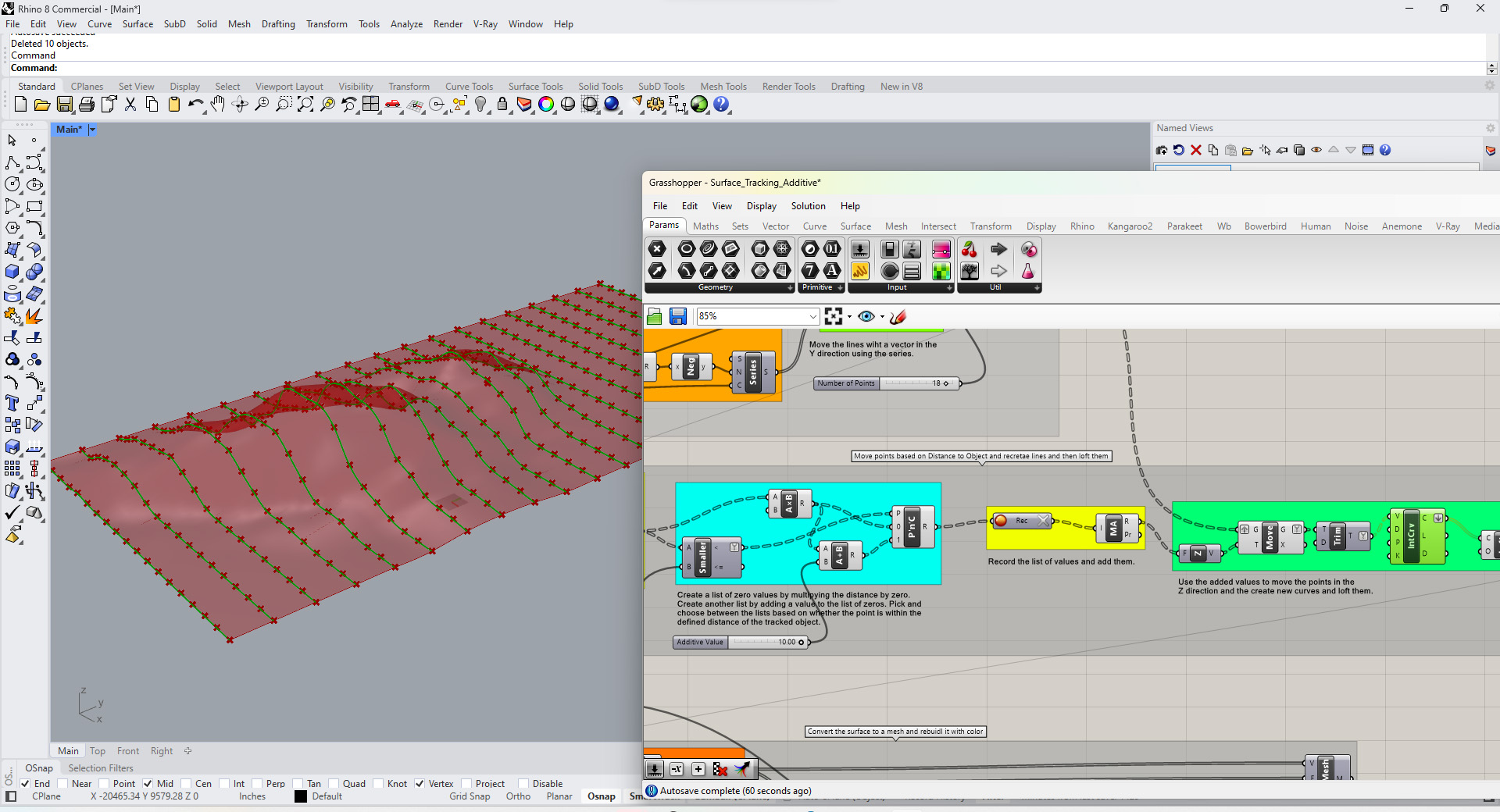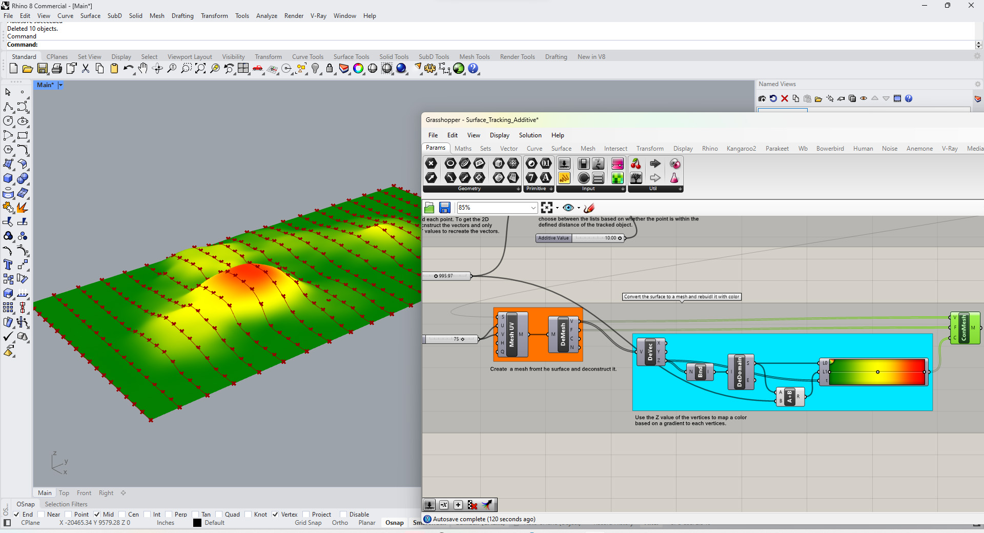 4. Same as the previous definition: To map a gradient based on height of the surface we need to create a mesh and then rebuild it. Once we convert the surface to a mesh we can deconstruct the mesh and then recreate it with its vertices and faces. We can give each vertices a color based on its Z value mapped to a gradient.