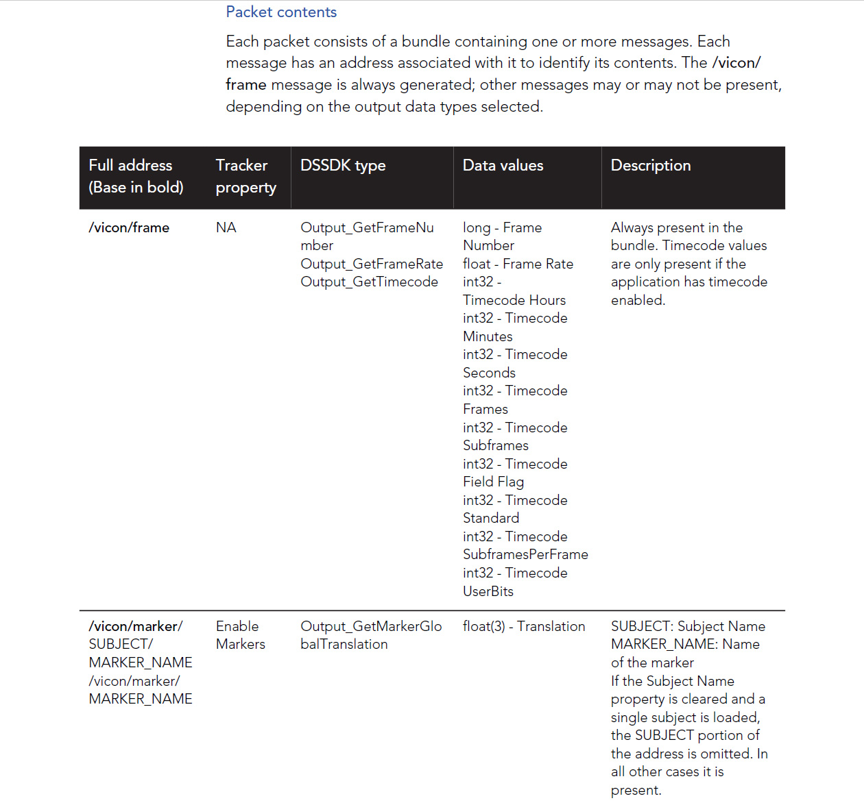 The above excerpt from the manual shows the types of data that will be sent when you have Enable Markers turned on. Below is an example of the data that will be sent for an “Object” with 3 markers each frame: